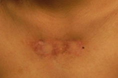 Hypertrophic and keloid scars are variations of the normal healing process of wounds. In a phenomenon, an abnormal scar continuous to increase collagen production. The wound starts to develop thick scar tissue which expands both sideways as much as deeply into the skin. There arête types of abnormal scars, hypertrophic and keloid scars. Hypertrophic scars do not exceed the limits of the original lesion although its appearance is slightly raised. The term keloid scars applies to those that are out of the margins of the original lesion invading nearby tissues. Applying transinolona, by injections, reduce the appearance of the scars.. It is applied several times depending on the size of the scar.