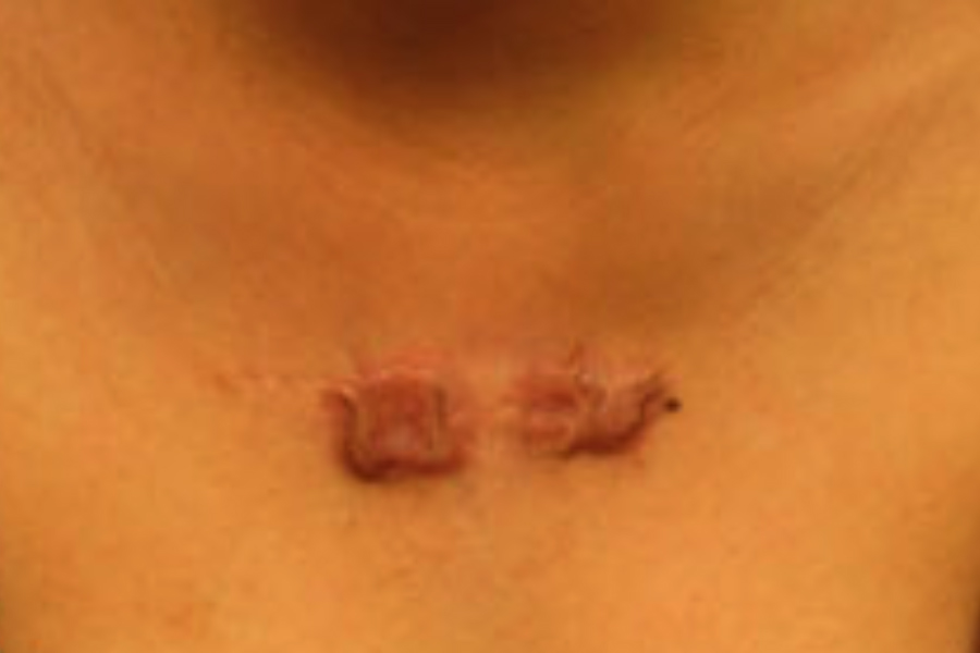 Las cicatrices hipertróficas y queloides son variaciones del proceso normal de cicatrización de las heridas. Existen dos clases de cicatrices anormales; las cicatrices hipertróficas y las queloides. En la cicatriz anormal ocurre un fenómeno de aumento contínuo de la producción de colágeno. La herida se expande en todas direcciones, se eleva sobre la piel y es también más profunda y ancha de lo normal. La cicatriz hipertrófica es aquella lesión que no sobrepasa los límites de la lesión original aunque su aspecto sea ligeramente levantado. El termino queloide, se aplica a aquellas cicatrices que se salen de los márgenes de la lesión original invadiendo tejidos cercanos. La aplicación de transinolona es el tratamiento inyectable para disminuir este tipo de cicatriz. Consiste en inyectar dosis en repetidas ocasiones de acuerdo al tamaño de la cicatriz.